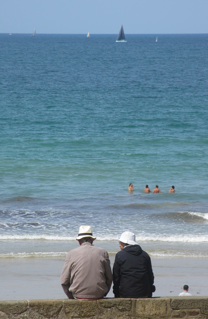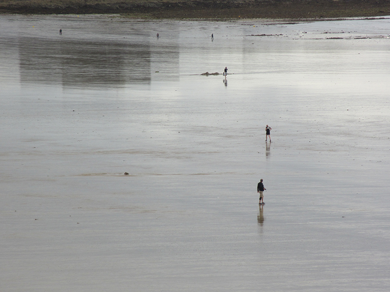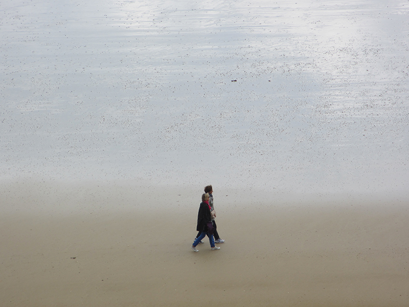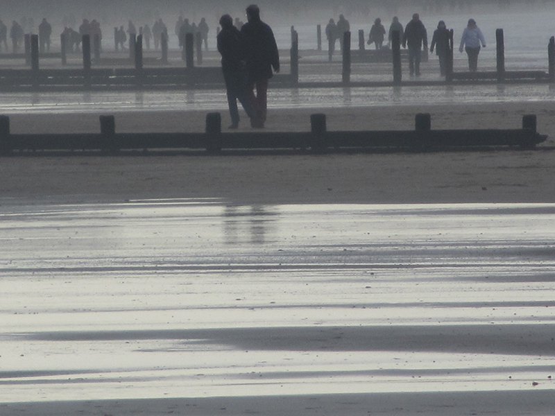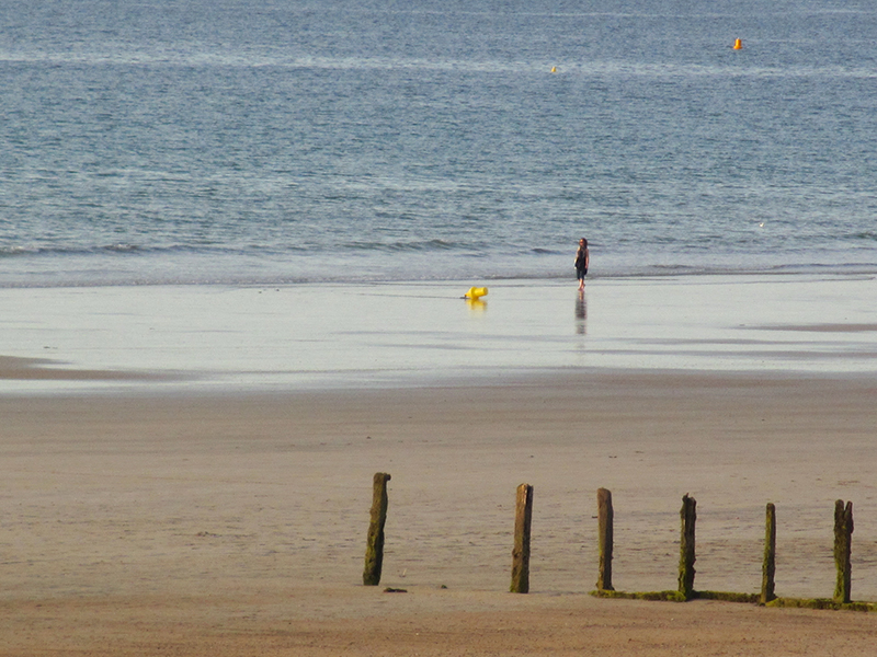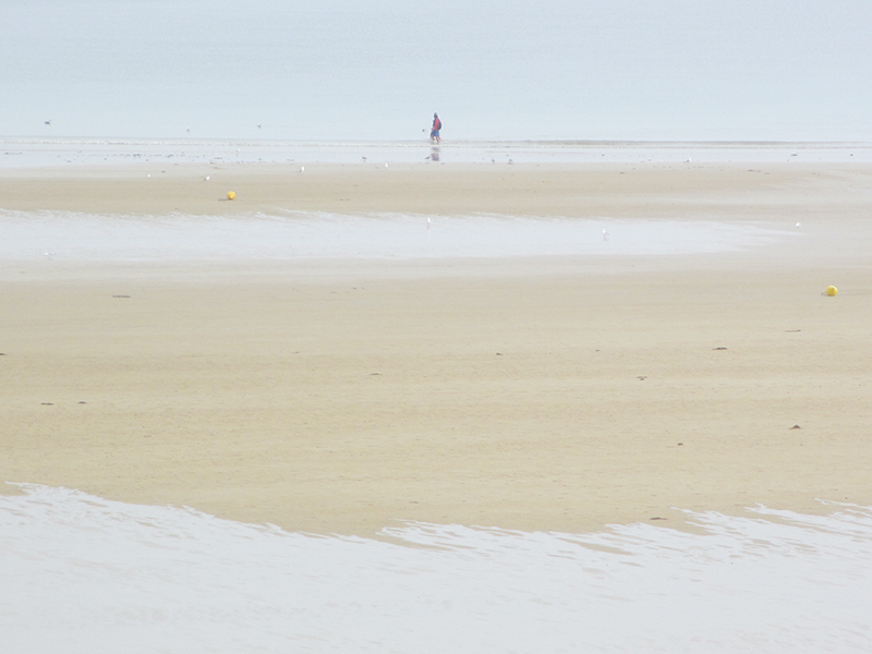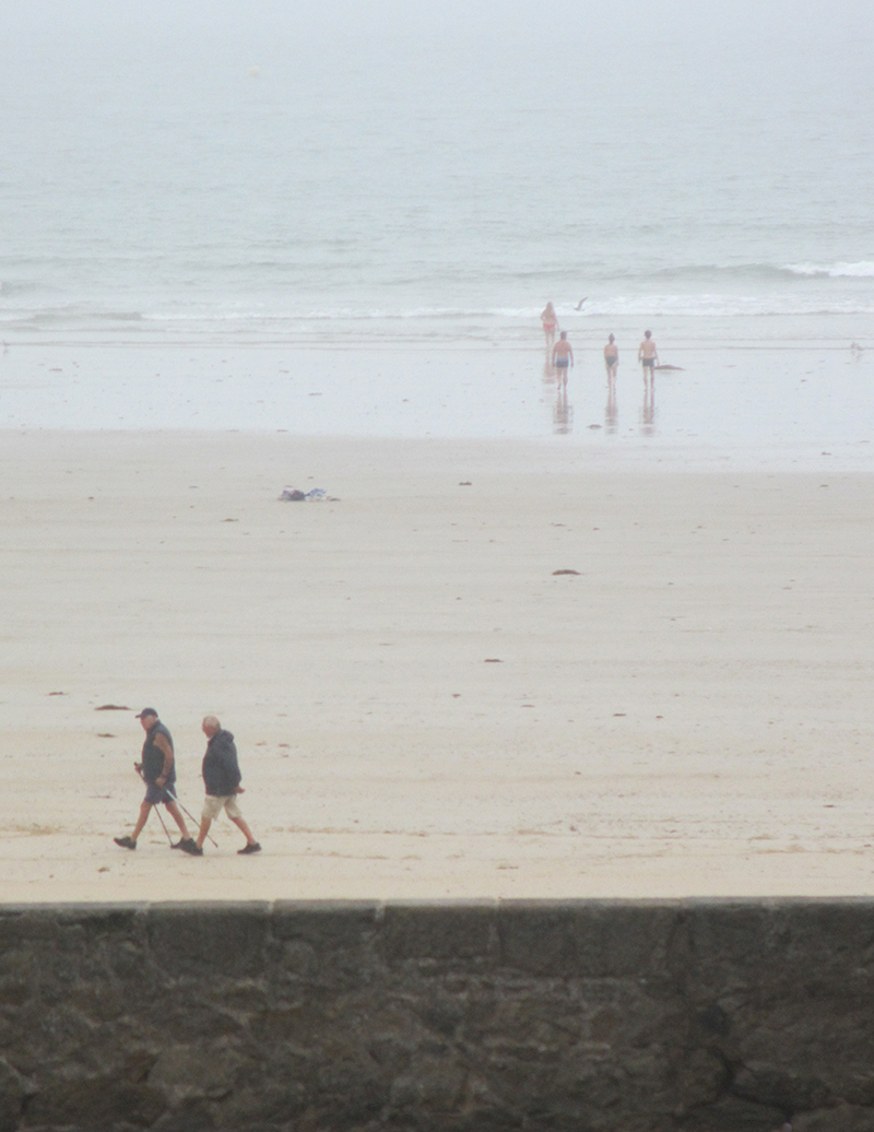 les allées et venues sur la digue, sur la grande plage, dans la mer, temps suspendu, contemplation