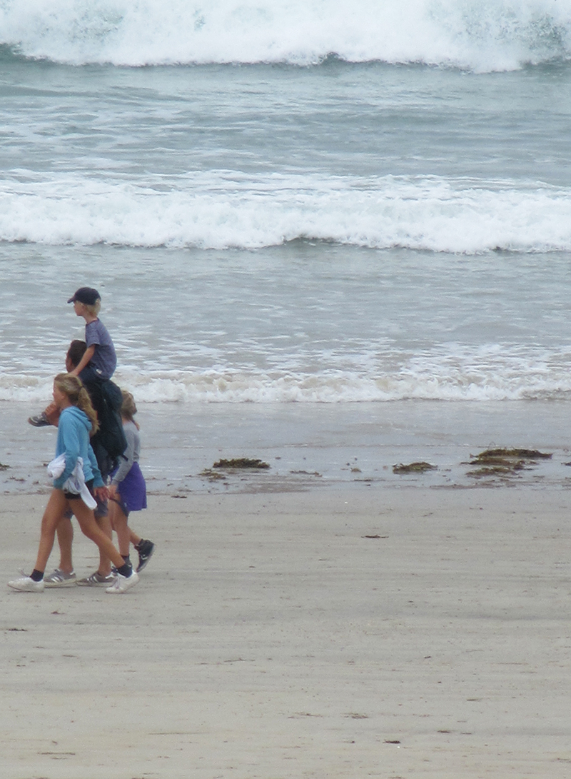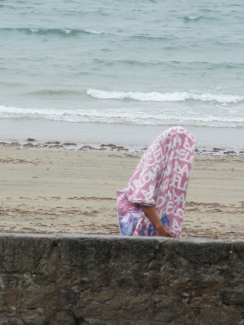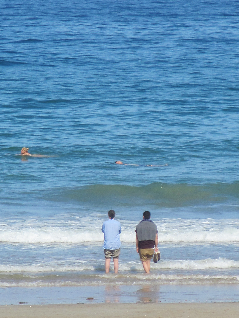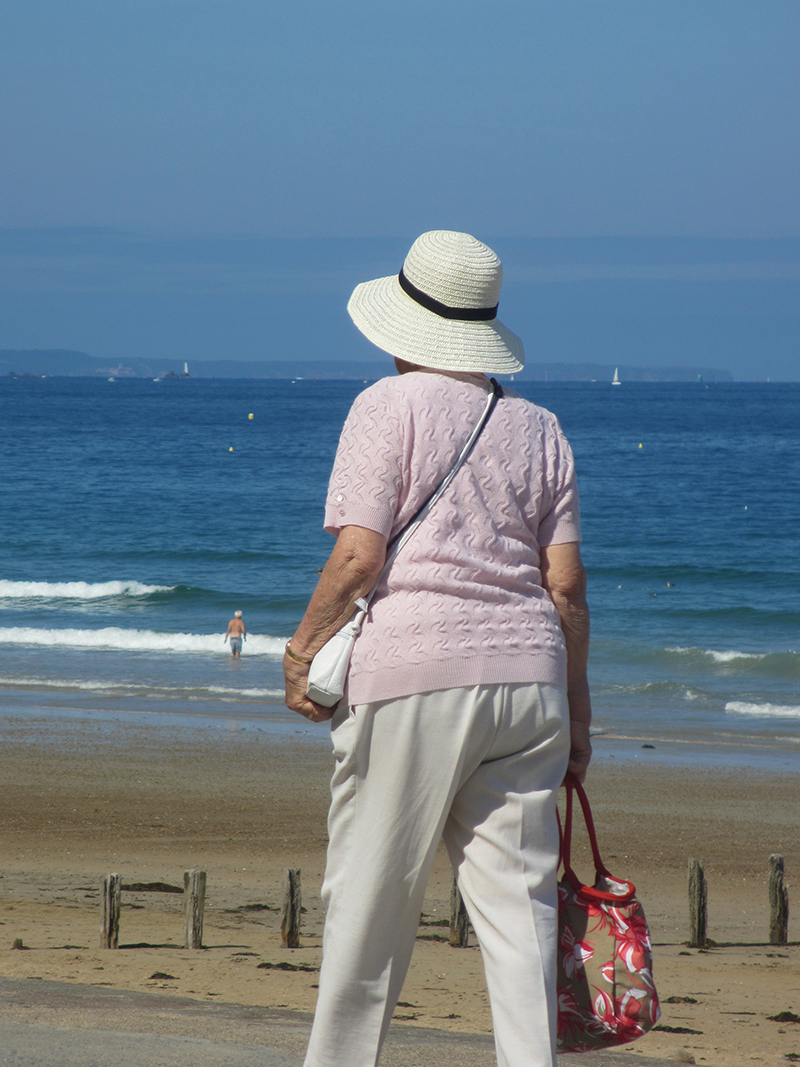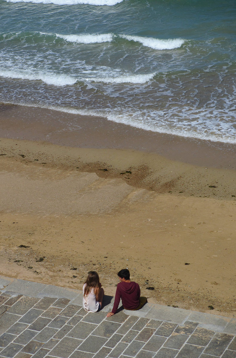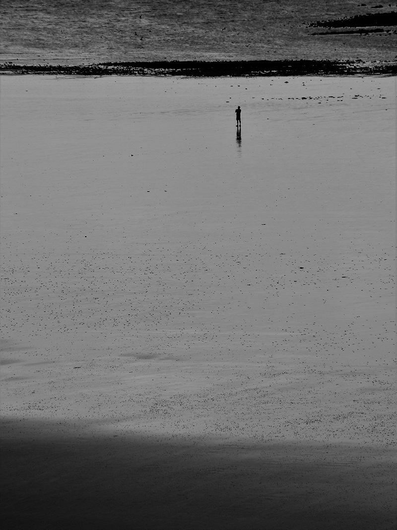 les allées et venues sur la digue, sur la grande plage, dans la mer, temps suspendu, contemplation