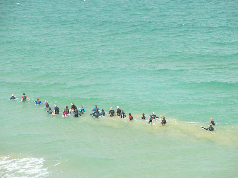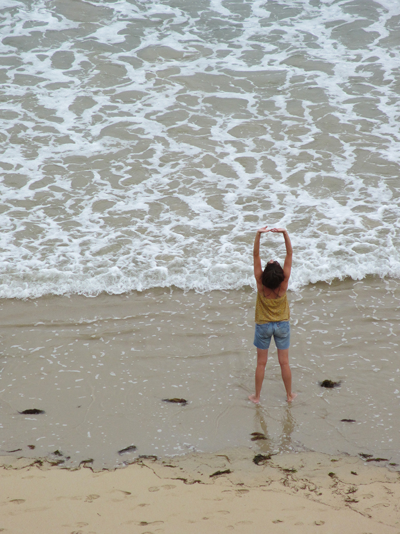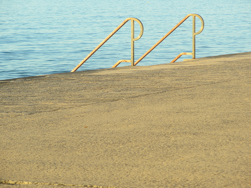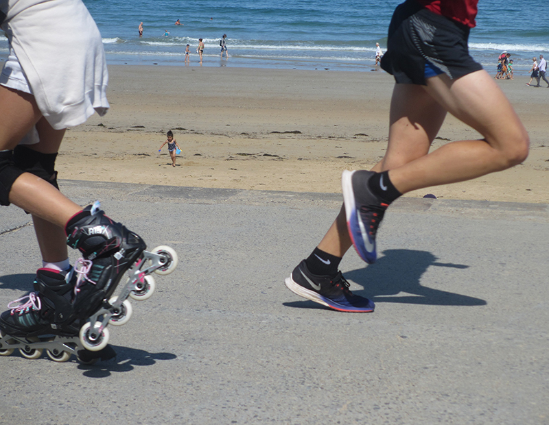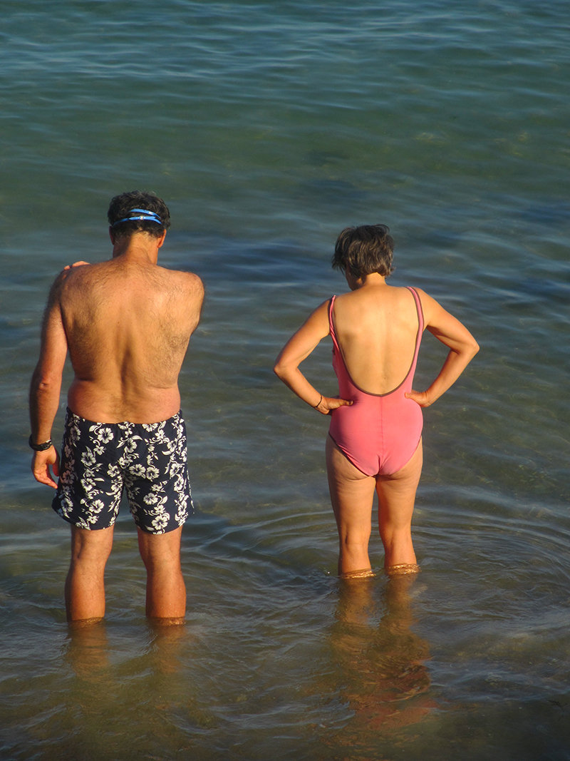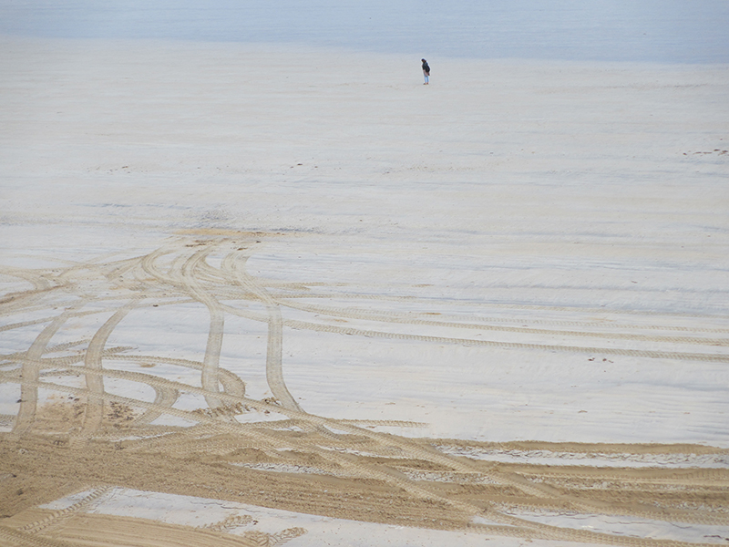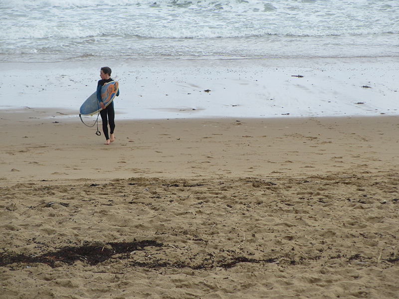 les allées et venues sur la digue, sur la grande plage, dans la mer, temps suspendu, contemplation